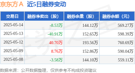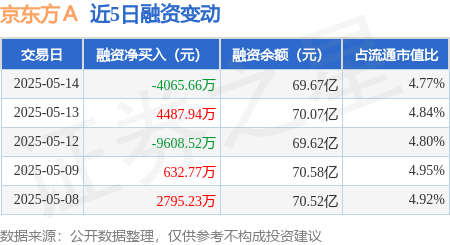 本站消息,5月14日,京东方A(000725)融资买入2.63亿元,融资偿还3.04亿元,融资净卖出4065.66万元,融资余额69.67亿元,近20个交易日中有12个交易日出现融资净买入。